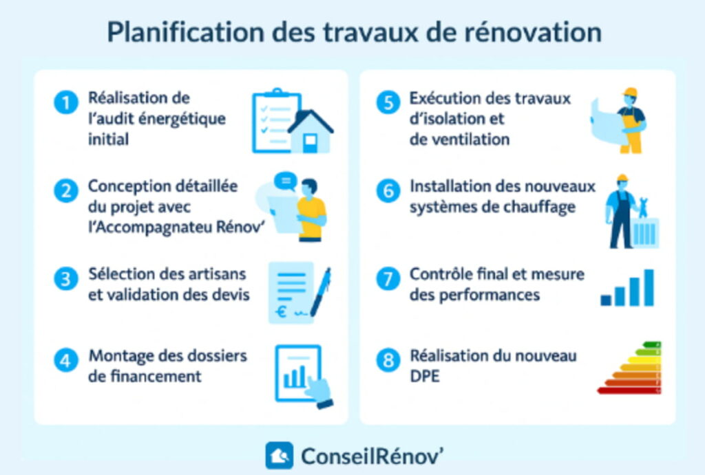 Pour une rénovation globale efficace, les étapes de travaux doivent suivre un ordre logique :